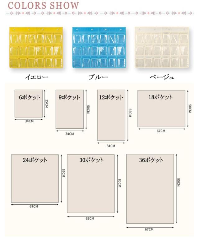 | 6/9/12/18/24/30/36ポケット 厚めのPVC透明フイルムで中の物が一目瞭然 ポケットの周りを2重縫製 立体構造なので、出し入れが簡単、厚みのある物も収納できる | |