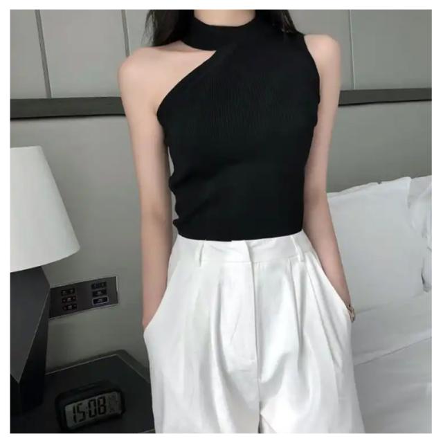 サマーニット レディース ワンショルダー トップス インナー ベアトップ カットソー へそ出し 肌見せ ノースリーブ リブニット リブカットソー 斜め襟 肩だし 肩見せ ニット Tシャツ リブ編み 夏 春 オフィス カジュアル 無地 送料無料
