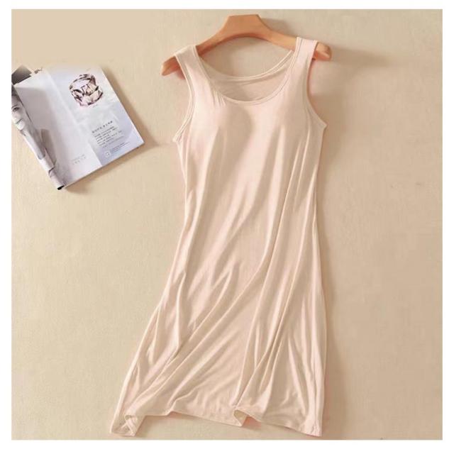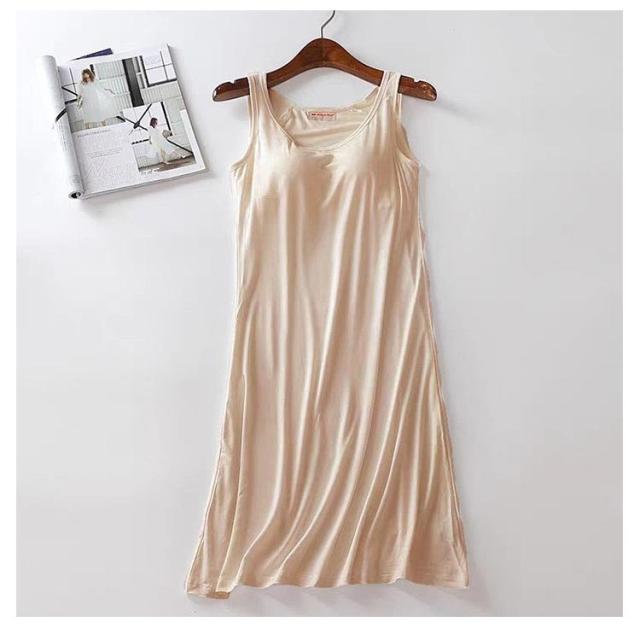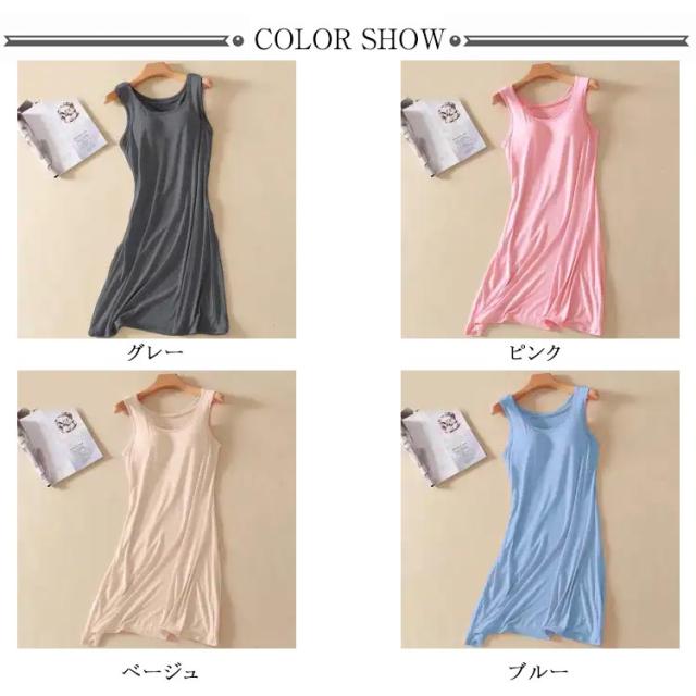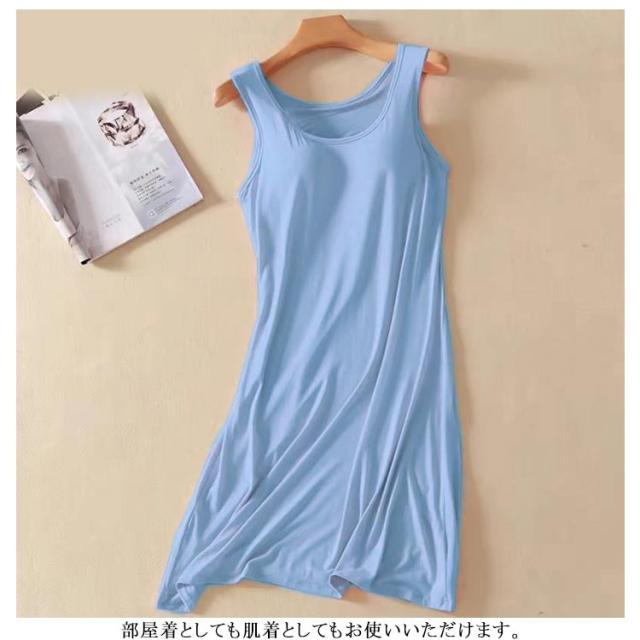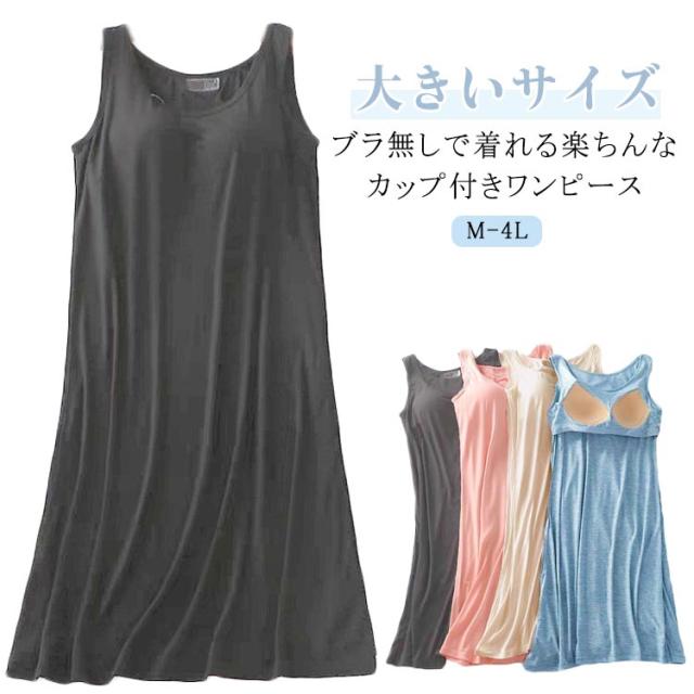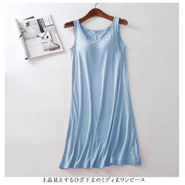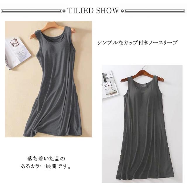 | ブラ無しで着れる楽ちんなカップ付きワンピース シンプルなカップ付きノースリーブ 上品見えするひざ下丈のミディ丈ワンピース 部屋着としても肌着としてもお使いいただけます。 カップがズレにくく、着心地が良いとの声をいただいております 落ち着いた品のあるカラー展開です。 | |