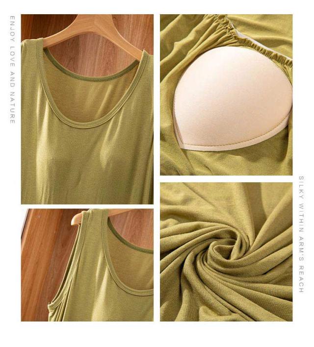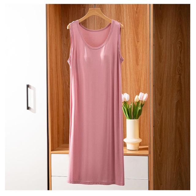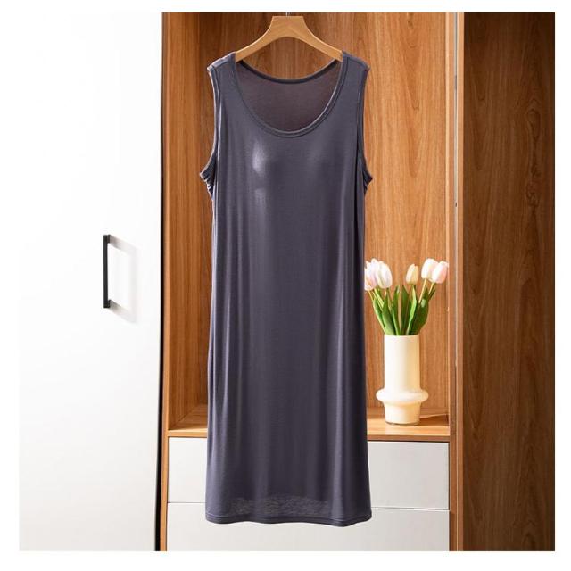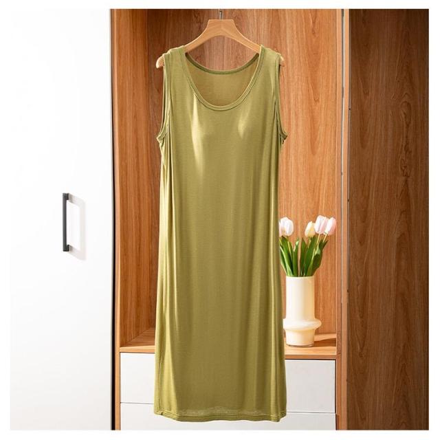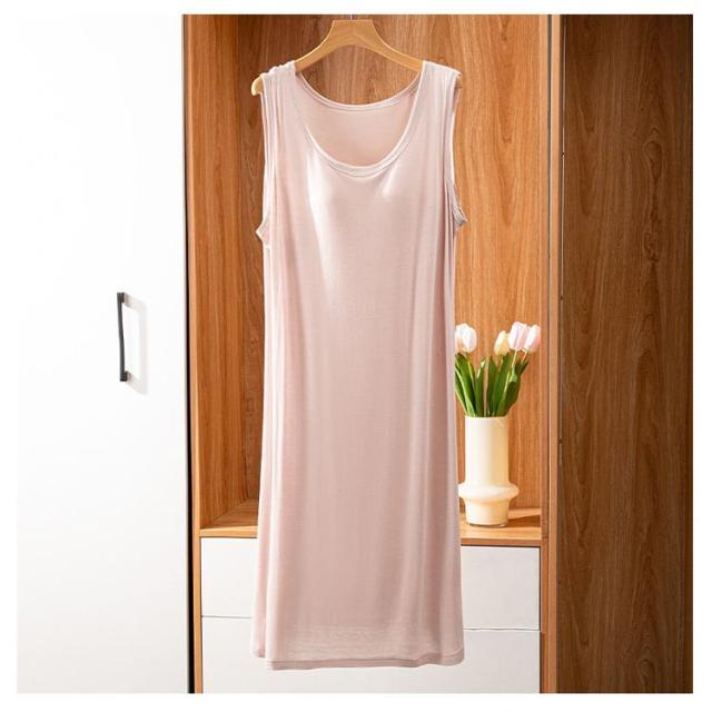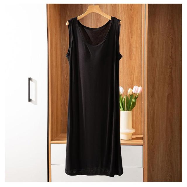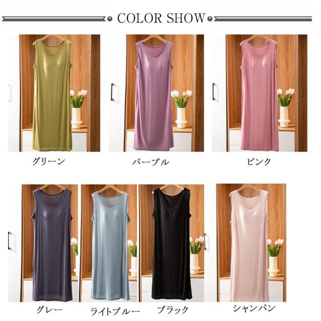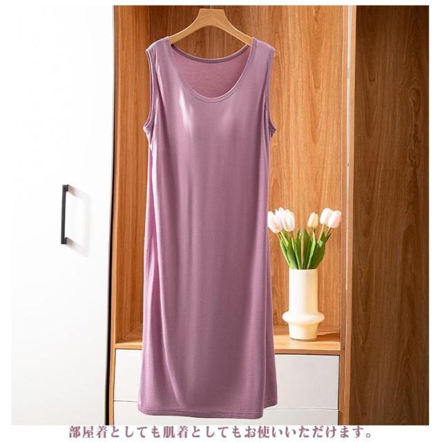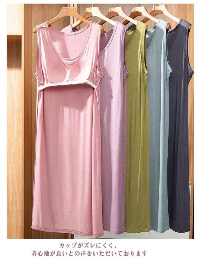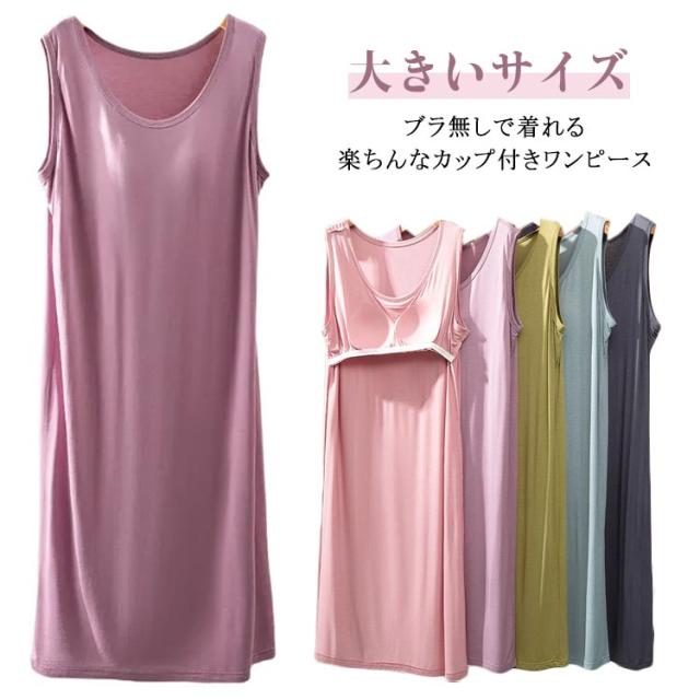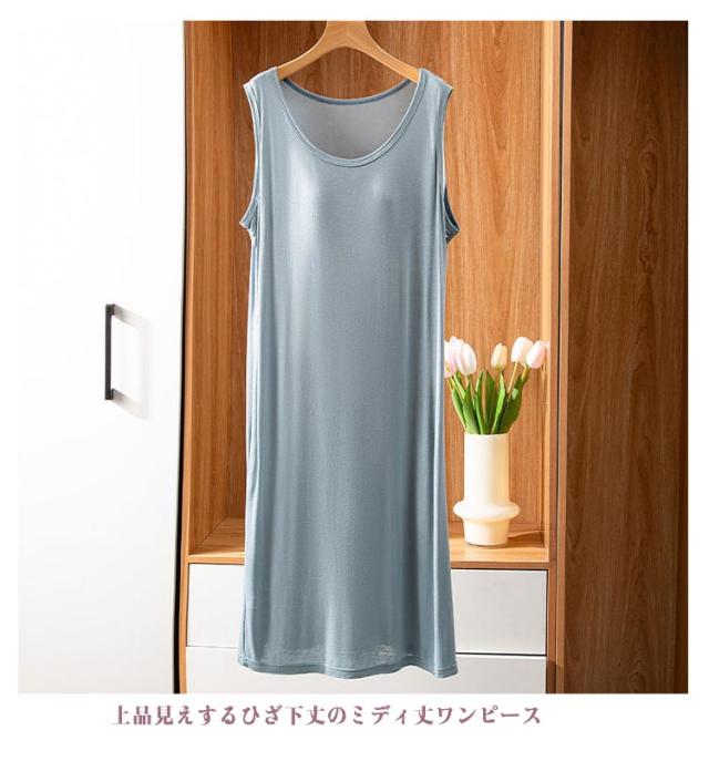 | ブラ無しで着れる楽ちんなカップ付きワンピース シンプルなカップ付きノースリーブ 上品見えするひざ下丈のミディ丈ワンピース 部屋着としても肌着としてもお使いいただけます。 カップがズレにくく、着心地が良いとの声をいただいております 落ち着いた品のあるカラー展開です。 | |