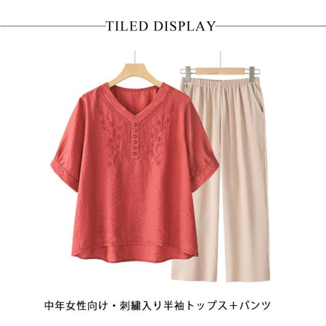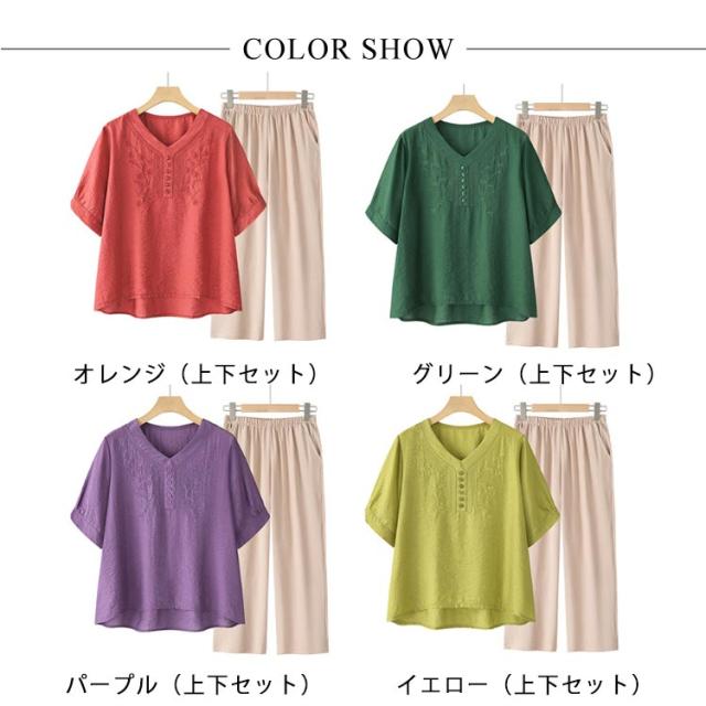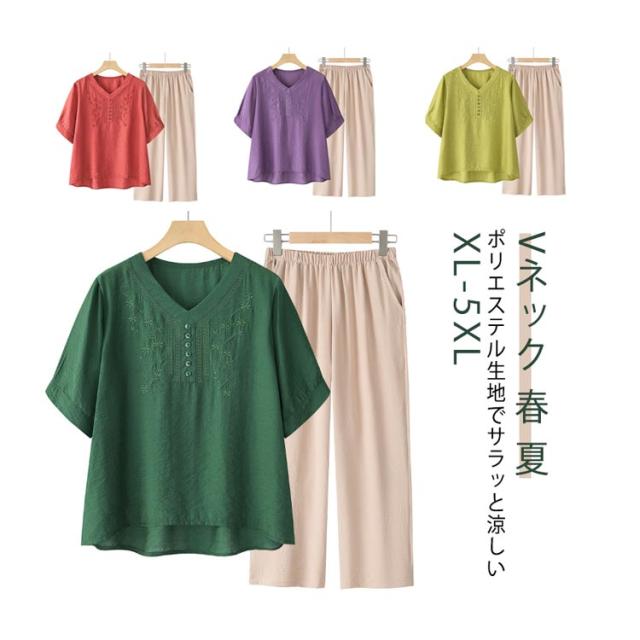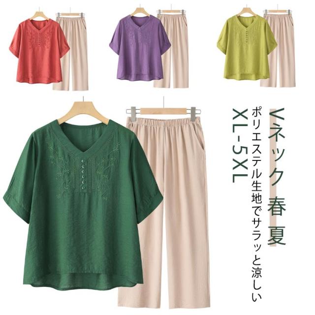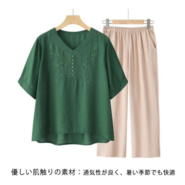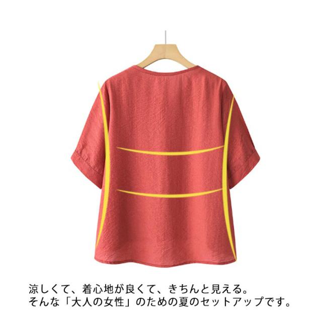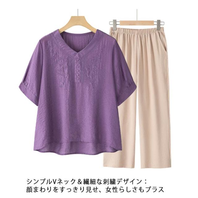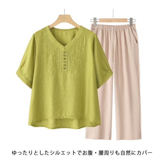 ママスーツ レディース ブラウス リネンライク パンツスーツ パンツスーツ 半袖トップス 上下セット ワイドパンツ Vネック 春 夏 セットアップ シンプル きれいめ 大きいサイズ 母親 30代 40代