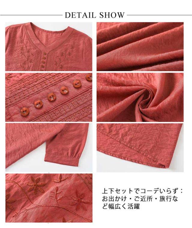 | 【ポリエステル生地でサラッと涼しい】 中年女性向け・刺繍入り半袖トップス+パンツ 優しい肌触りの素材:通気性が良く、暑い季節でも快適 シンプルVネック&繊細な刺繍デザイン:顔まわりをすっきり見せ、女性らしさもプラス ゆったりとしたシルエットでお腹・腰周りも自然にカバー 上下セットでコーデいらず:お出かけ・ご近所・旅行など幅広く活躍 洗っても型崩れしにくく、毛玉になりにくい:お手入れ簡単で毎日使いやすい 涼しくて、着心地が良くて、きちんと見える。 そんな「大人の女性」のための夏のセットアップです。 | |