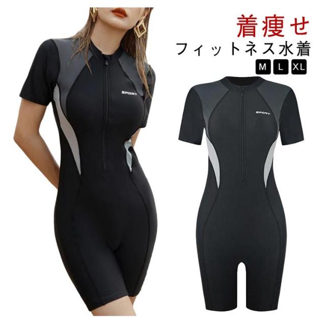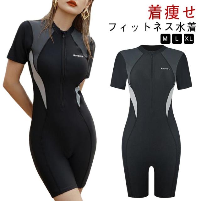 競泳用 半袖 プール レディース 30代 着痩せ 競泳水着 練習用 水着 女性 フィットネス水着 運動用 プール 海水浴 お洒落 50代 オールインワン フィットネス ママ水着 ジム 40代 フィットネス水着 スイムウェア 水泳 スイミング めくれ防止 配色 かわいい ブラック 黒