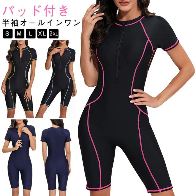 フィットネス水着 フィットネス水着 半袖 レディース トレーニング用 海水浴 オールインワン フィットネス ジム ジップアップ 女性 運動用 練習用 プール パッド付き 体型カバー 着痩せ おしゃれ ママ水着 30代 40代 50代 スイムウェア