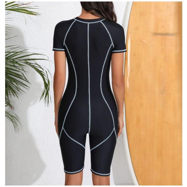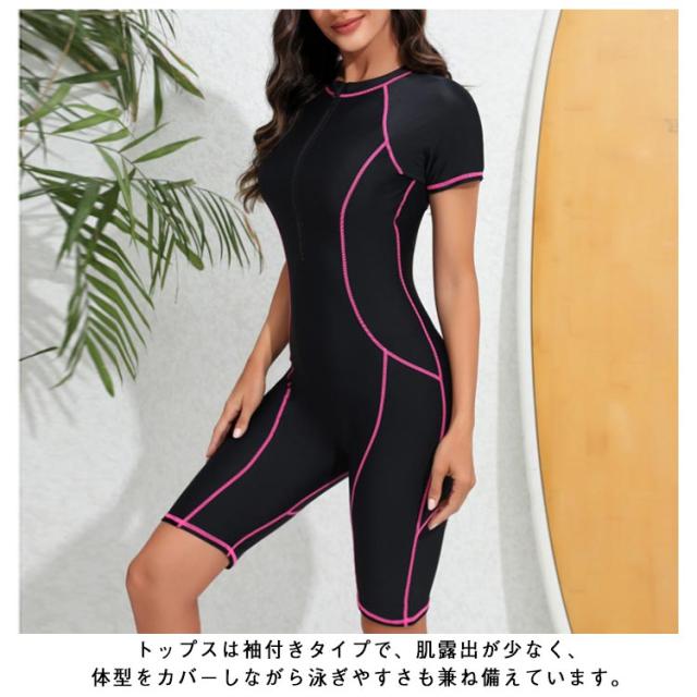 | このフィットネス水着は、腕・デコルテ・腿まわりを隠してくれる半袖オールインワンです。【パッド付き】 トップスは袖付きタイプで、肌露出が少なく、体型をカバーしながら泳ぎやすさも兼ね備えています。 ウエストラインにデザインされた流線形は水の抵抗を減らし、泳ぎの向上をサポート。 伸縮性に優れており、体型カバー・細見え効果も期待できます。 ファスナー付きで着替えやすく、取り外し可能なカップが付いているため、快適に着用できます。 お尻から太ももまでを覆い、足の付け根やお尻の形が目立ちにくい。 | |