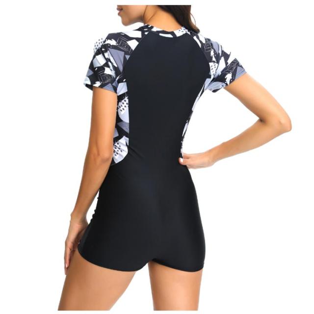 | このフィットネス水着は、腕・デコルテ・腿まわりを隠してくれる半袖オールインワンです。 トップスは袖付きタイプで、肌露出が少なく、体型をカバーしながら泳ぎやすさも兼ね備えています。 ウエストラインにデザインされた流線形は水の抵抗を減らし、泳ぎの向上をサポート。 伸縮性に優れており、体型カバー・細見え効果も期待できます。 ファスナー付きで着替えやすい。 お尻から太ももまでを覆い、足の付け根やお尻の形が目立ちにくい。 | |