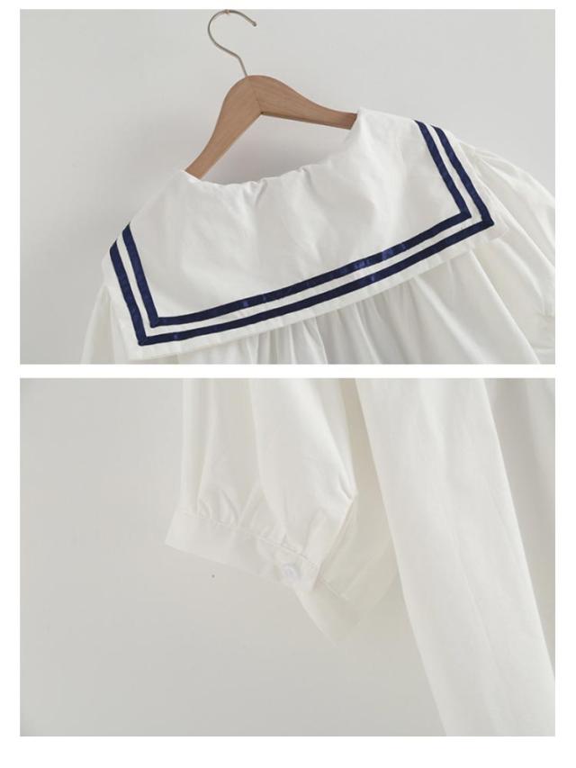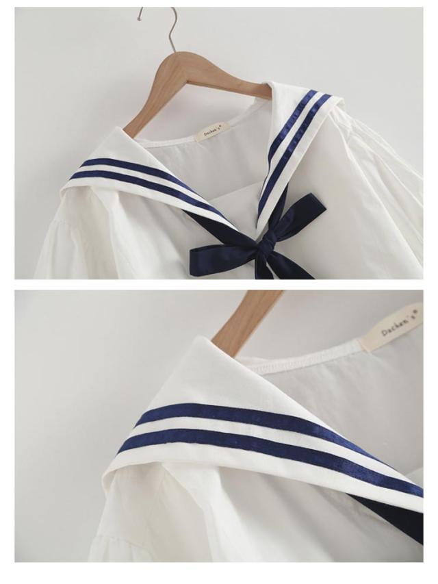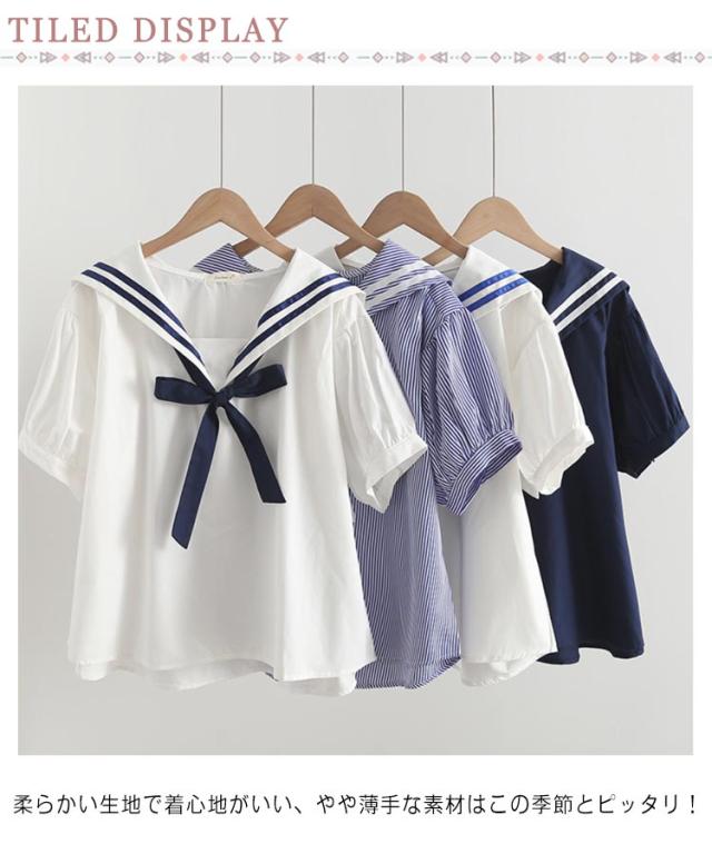 プルオーバー リボン ブラウス セーラー襟 半袖 制服 綿 マリン風半袖 学園祭 Tシャツ コットン 森ガール系 フリーサイズ ゆったり セーラーカラー 夏 レディース 半袖 カジュアル ゆったり 白 ブルー 紺色 大人可愛い