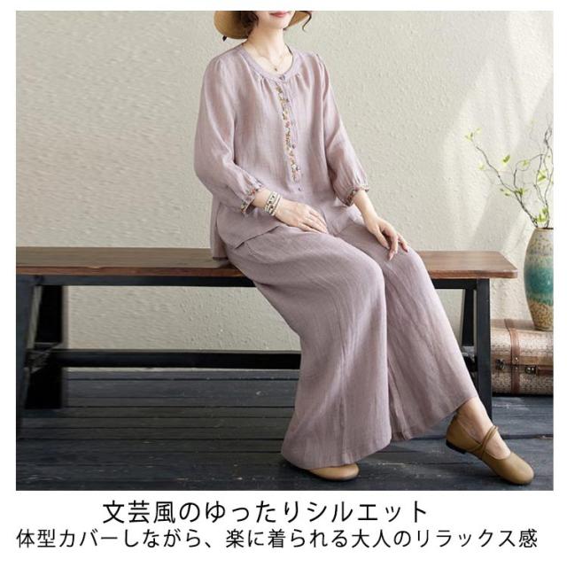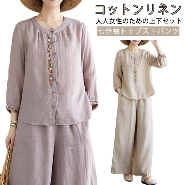 上下セット ロングパンツ 七分袖 ブラウス チャイナ風 セットアップ トップス 綿 刺繍 ナチュラル 通気性 コットン チャイナ風 体型カバー 大人女性 カジュアル お出かけ オフィス 春