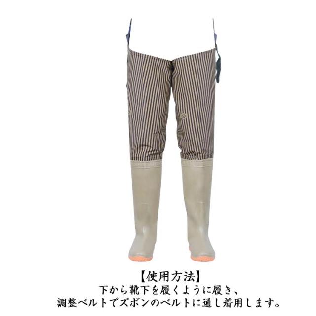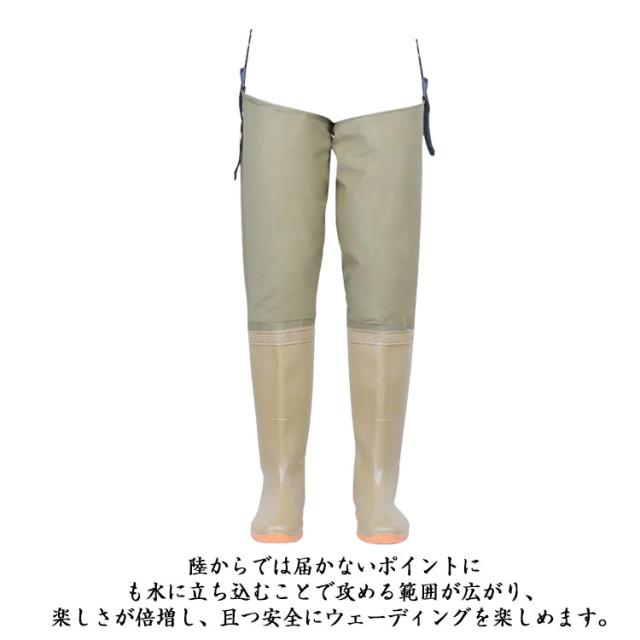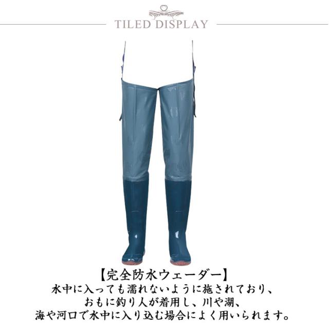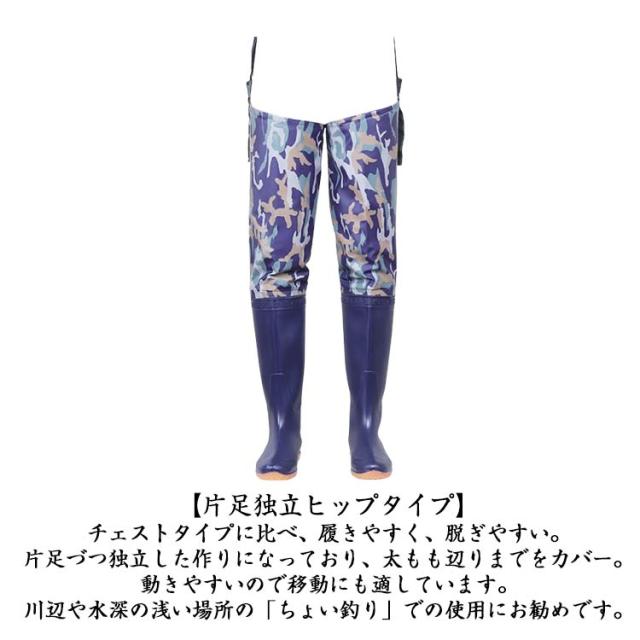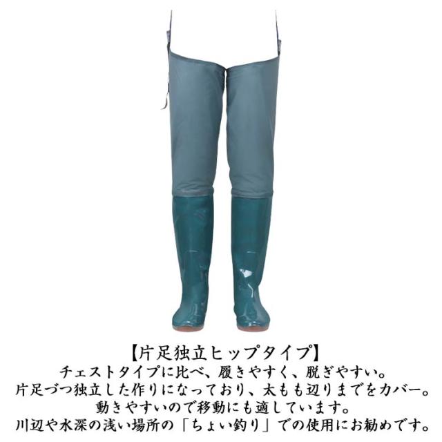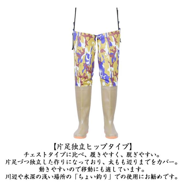 | 【完全防水ウェーダー】 水中に入っても濡れないように施されており、 おもに釣り人が着用し、川や湖、海や河口で水中に入り込む場合によく用いられます。 陸からでは届かないポイントにも水に立ち込むことで攻める範囲が広がり、 楽しさが倍増し、且つ安全にウェーディングを楽しめます。 【片足独立ヒップタイプ】 チェストタイプに比べ、履きやすく、脱ぎやすい。 片足づつ独立した作りになっており、太もも辺りまでをカバー。 動きやすいので移動にも適しています。 川辺や水深の浅い場所の「ちょい釣り」での使用にお勧めです。 【様々な場所で活躍】 渓流でのルアー釣りや、川釣り、潮干狩り、水産加工場、魚市場での現場作業着に、 また、田植えや草刈りなど農作業や雪掻き、どぶ掃除のほか、 池の水を全部抜く時などにも大活躍しています。 【ナイロンウェーダー】 PVC加工で防水性・撥水性の高い生地が使われており、 水に濡れないのはもちろんですが、 水温で奪われる体温の低下スピードを遅くします。 【ソール/靴底】 ラジアルソールを採用しており、バス釣りや防波堤には最適です。 また、川底の危険を軽減出来るよう、 靴裏は厚底になっており踏みつけ怪我の防止になります。 【使用方法】 下から靴下を履くように履き、調整ベルトでズボンのベルトに通し着用します。 | |
