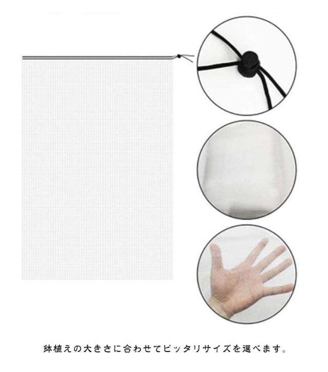 | 【防虫・防鳥植物保護カバー2枚セット!】【】【6サイズ!】【園芸・プランター・菜園に最適。】 防虫・鳥対策ネット!透明で通気性抜群、巾着式2枚入り。 植物の大きさに合わせて選べる豊富なサイズバリエーション。 鉢植えの大きさに合わせてピッタリサイズを選べます。 寒さや風、霜、害虫や鳥などから植物を保護し、花や、野菜の生育を助けます。 カバーを掛けるだけの簡単設置。巾着設計で、植物をしっかり保護できます。 | |