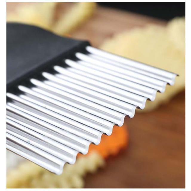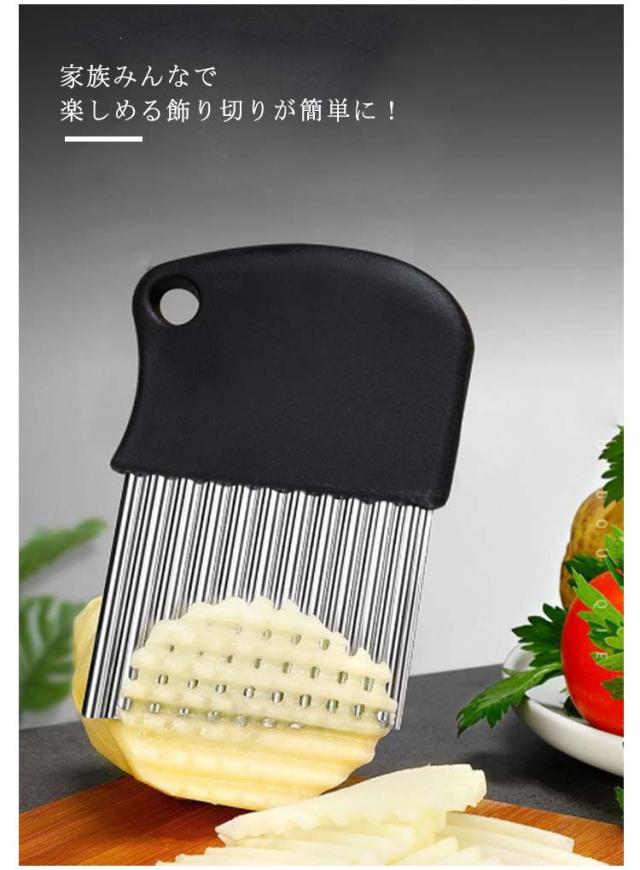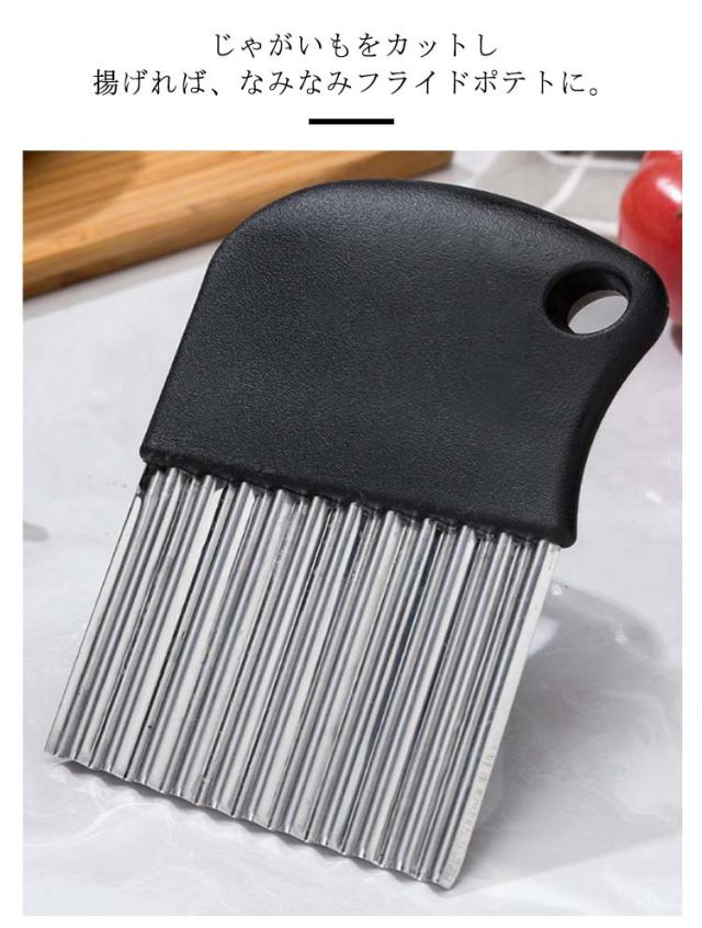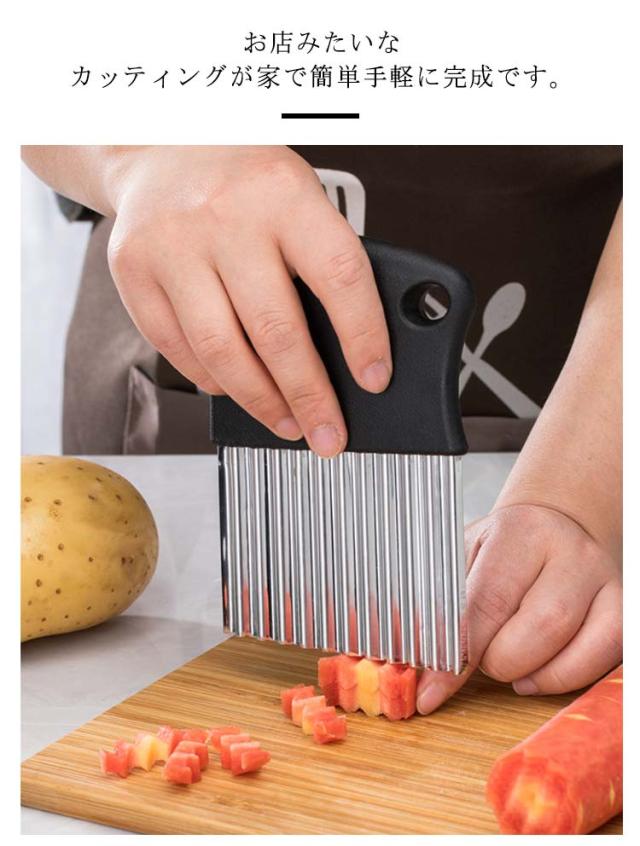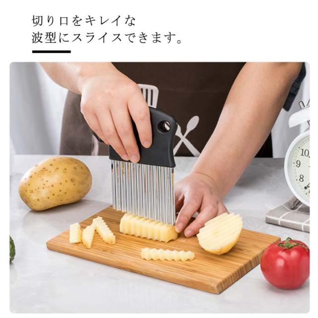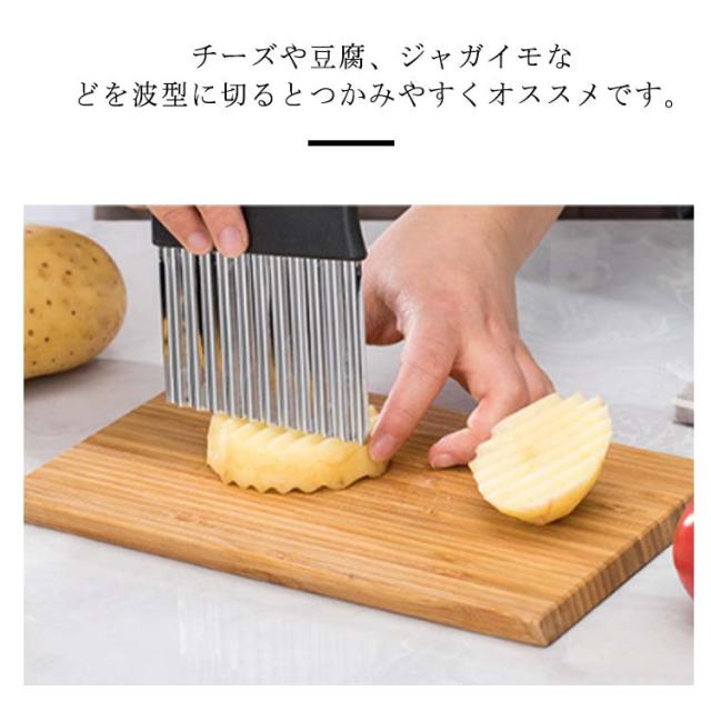 | 家族みんなで楽しめる飾り切りが簡単に! 切り口をキレイな波型にスライスできます。 お店みたいなカッティングが家で簡単手軽に完成です。 じゃがいもをカットし揚げれば、なみなみフライドポテトに。 チーズや豆腐、ジャガイモなどを波型に切るとつかみやすくオススメです。 | |