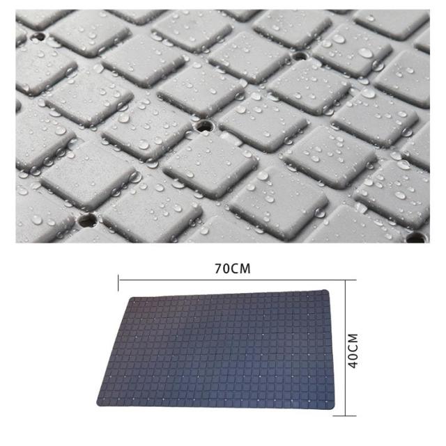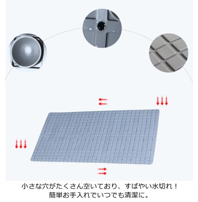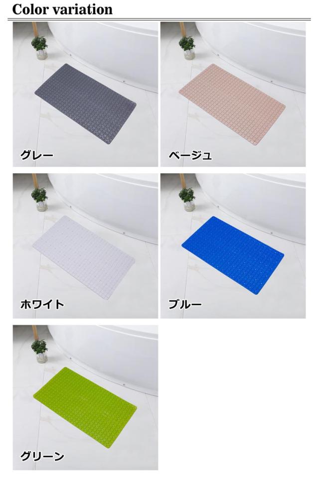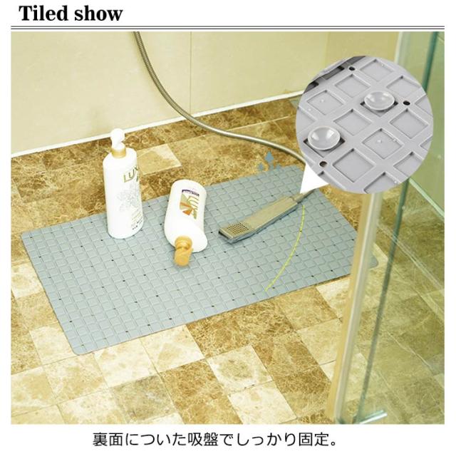 | 滑って転びやすいお風呂場での転倒防止に!吸盤付き滑り止め浴室マット。 裏面についた吸盤でしっかり固定。 小さな穴がたくさん空いており、すばやい水切れ!簡単お手入れでいつでも清潔に。 水が掛かる場所、滑りやすい場所にさっと置くだけで安全対策が出来ます。 介護、ご高齢の方、妊婦さん、小さなお子様の入浴を安心・安全・快適にサポートします。 | |