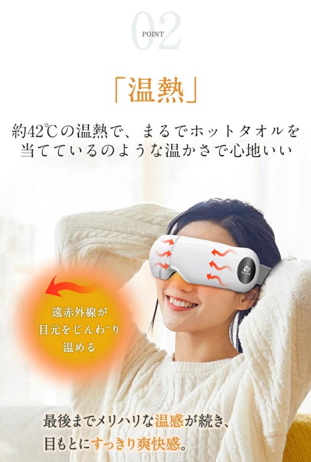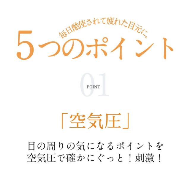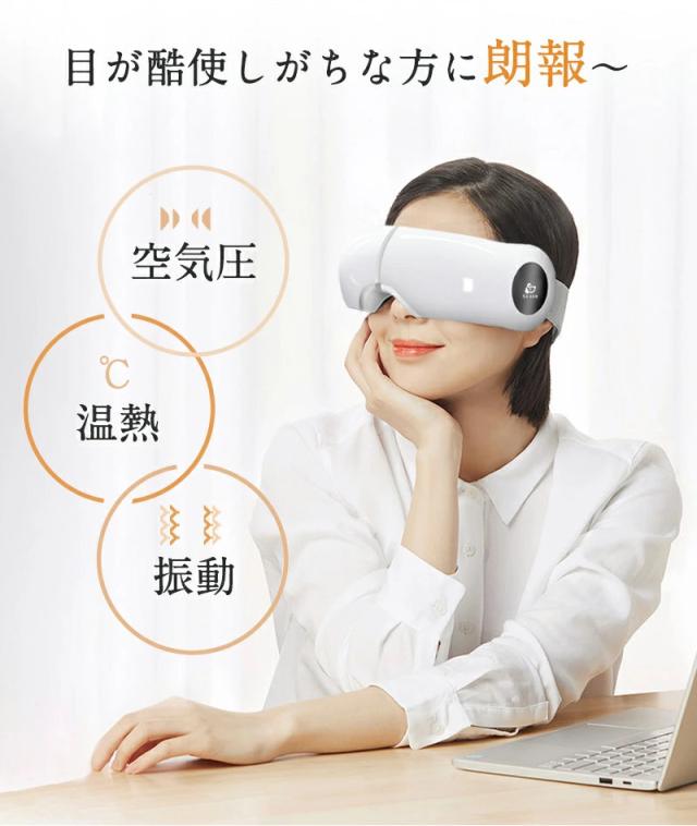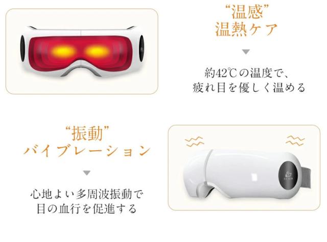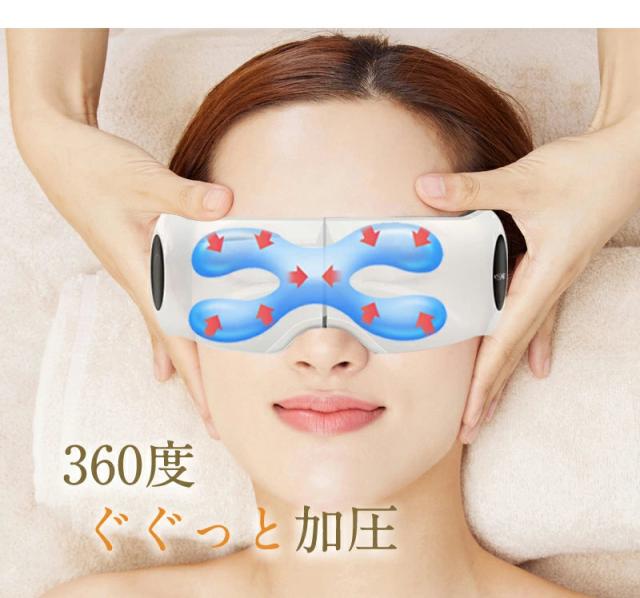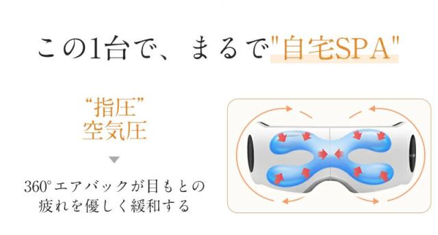 このアイマッサージャーには、目元を温める温熱機能や、振動やエアーによる加圧でマッサージをする機能が搭載されています。目元を温めたり、揉みほぐしたりすることで目元の血行を促進し、筋肉のこわばりを緩和させる効果が期待できます。