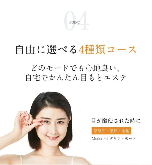 バイタリティモード・リラックスモード・スージングモード・アイケアモードの4つモードが搭載しているアイマッサージャーです。さまざまな目元ケアニーズに応じて選択できます。