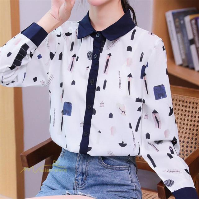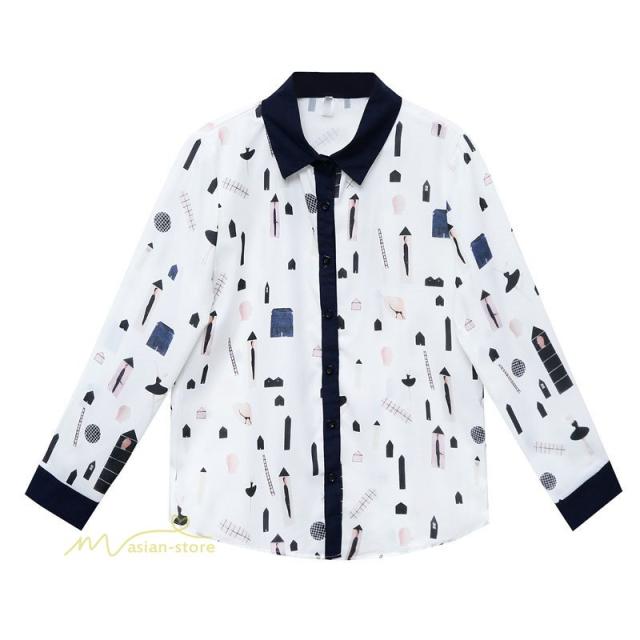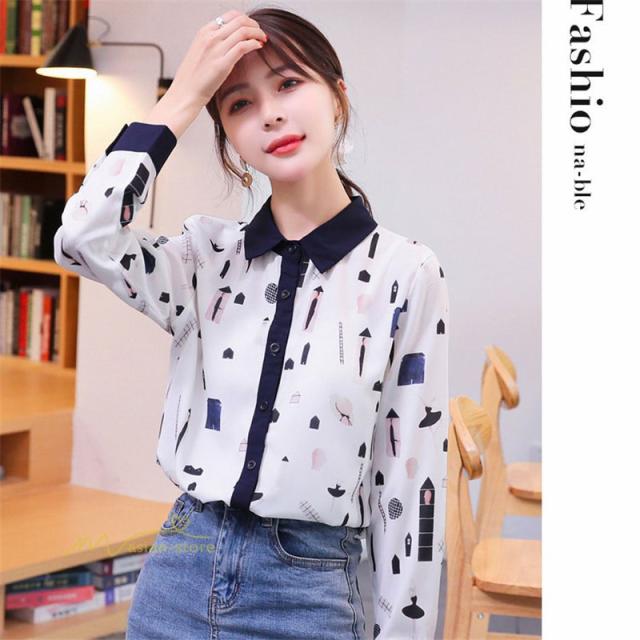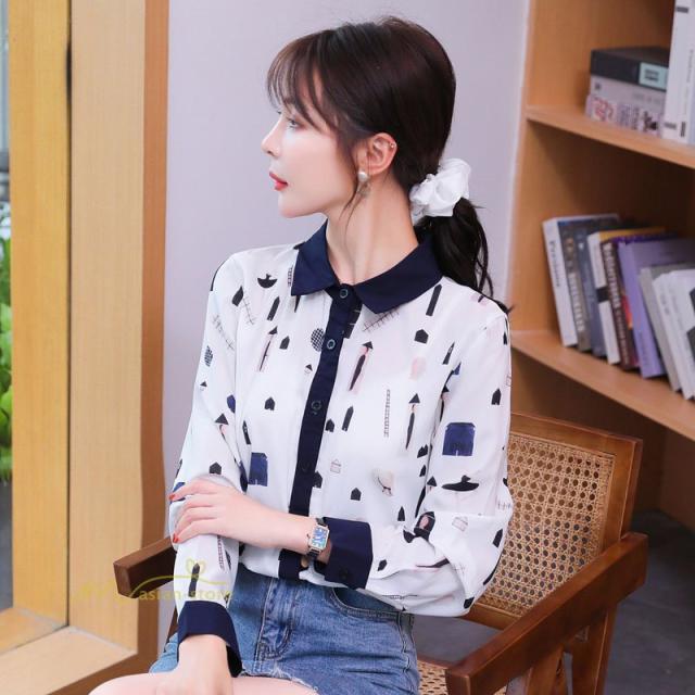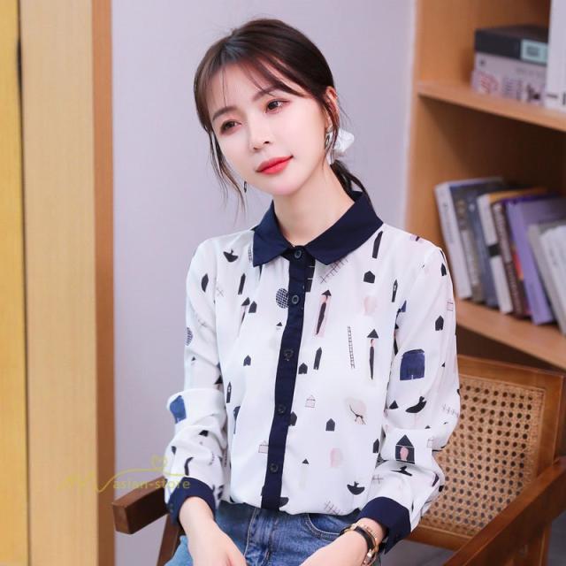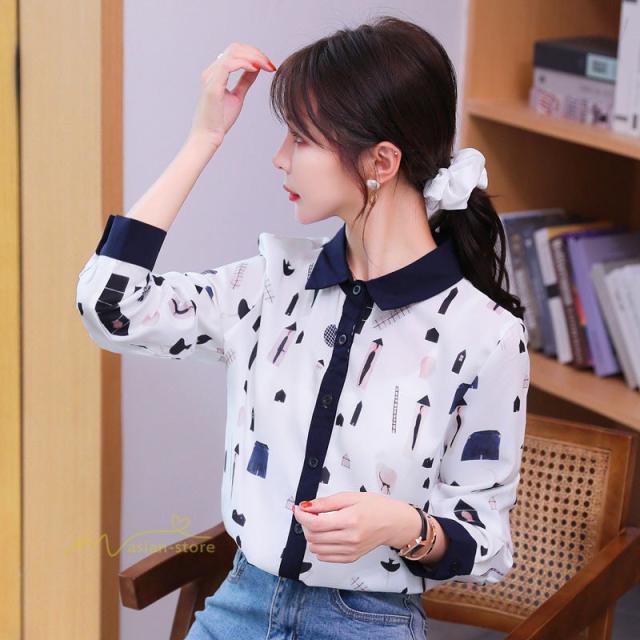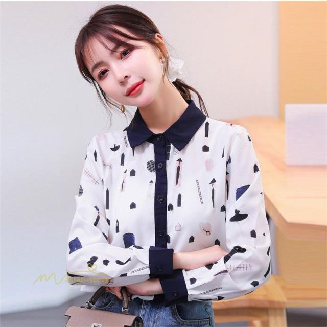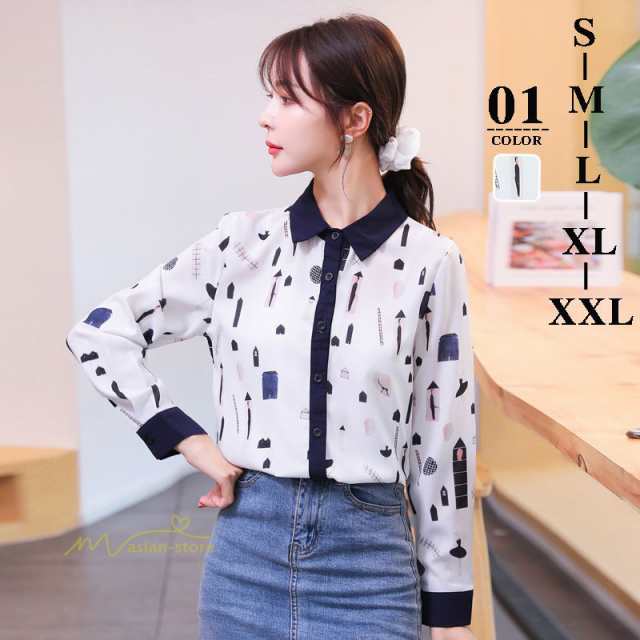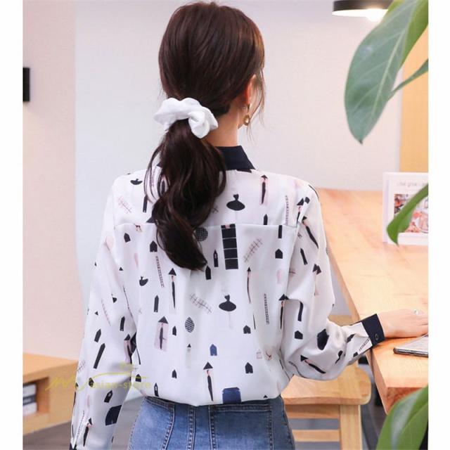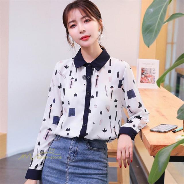 ブラウス シャツ シフォン レディース プリントシャツ 長袖 バイカラー ゆったり 薄手 トップス 韓国ファッション ガーリー トレンド シンプル 着痩せ 秋コーデ