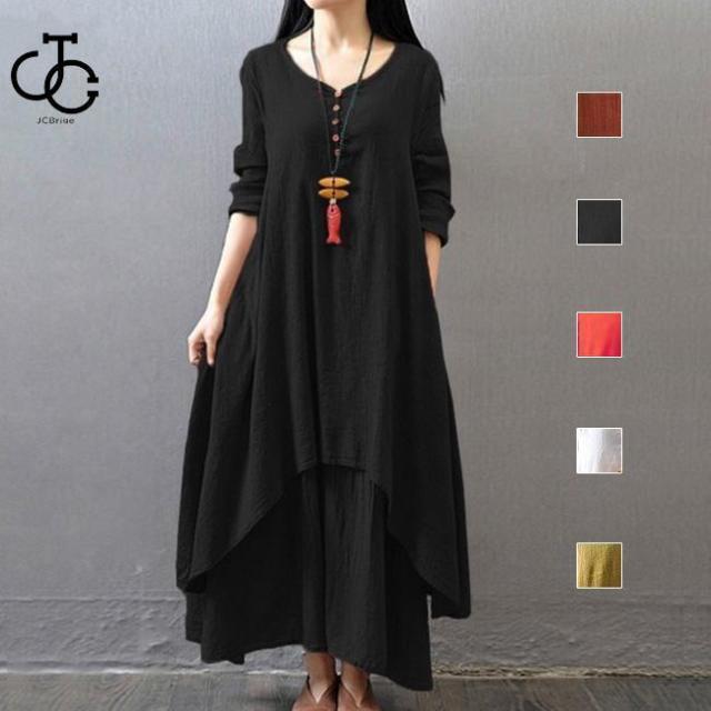 ワンピース ロングワンピース 麻綿ワンピース Aラインワンピース レイヤード風 ゆったりワンピース シンプル 無地
