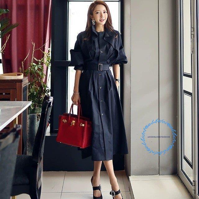 トレンチ風ワンピース ロング ミモレ丈 春 秋 冬 通勤 OL 紺色 フォーマル ロングワンピース ネイビー 長袖 トレンチコート レディース ベルト付き