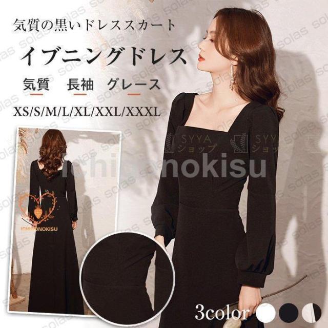 パーティードレス ワンピース ロング 秋冬 ロングドレス 演奏会 黒 イブニングドレス パーティー 成人式 忘年会 結婚式 Aラインカラードレス