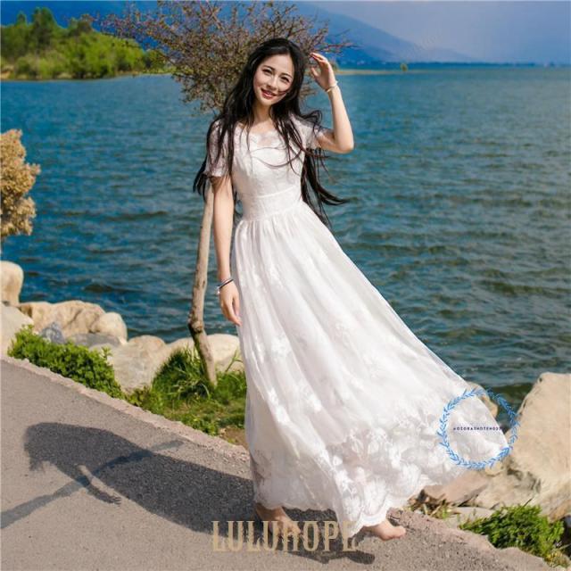 白ワンピース マキンワンピースレースワンピース レディース夏 ドレスパーティードレスロングドレス フレア袖 細身 結婚式 花嫁 二次会 披露宴