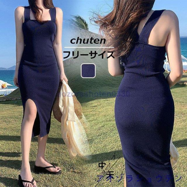 タイトワンピース ビーチワンピース ニットワンピース キャミソールワンピース 夏 レディース ミモレワンピース ノースリーブ スリット カジュアル シンプル