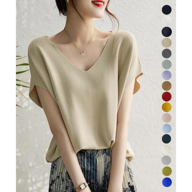 フレンチスリーブ ニットソー 体型カバー vネック 冷感タッチ 半袖 サマーニット きれいめ オフィスカジュアル 着やせ