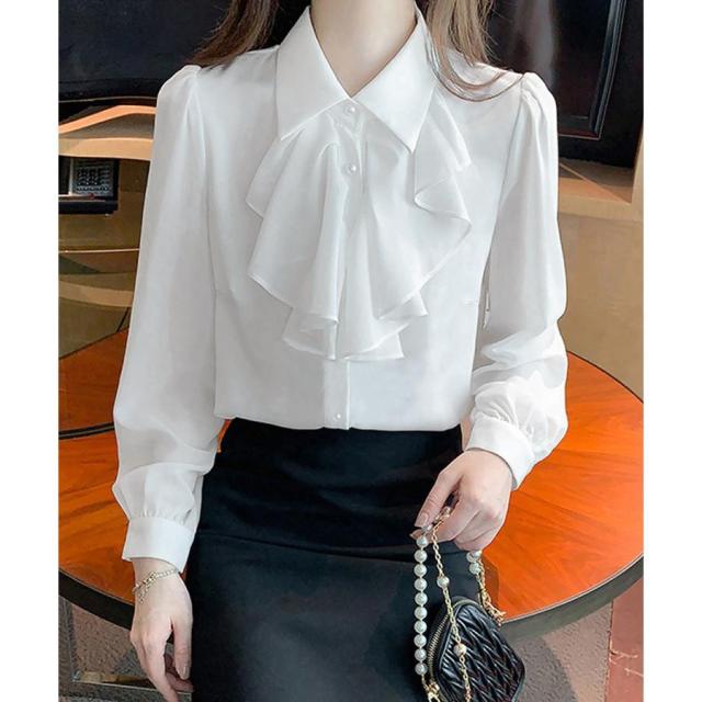 エレガントな雰囲気を漂わせるフリルリボンタイブラウス