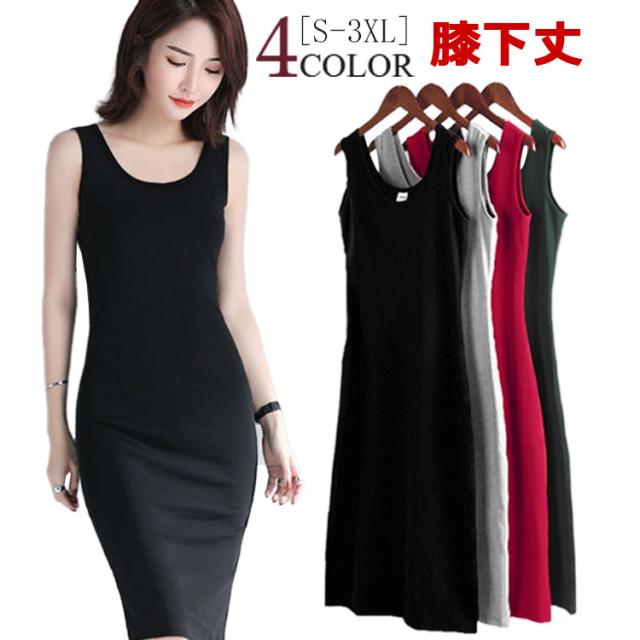 タイト ワンピース Uネック 無地 ノースリーブ ひざ下丈 レディース 夏 シンプル タンクトップワンピース きれいめ 細身 おしゃれ ボディコン クルーネック 大き インナーワンピース