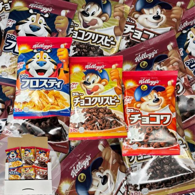 | その他 | ・ケロッグ人気のキッズシリアル3種類(コーンフロスティ、チョコクリスピー、チョコワ)のアソートです。 ・1袋ずつ小分けになっているので毎日違った種類を楽しむことができます。時間のない朝食やお子様のおやつにも最適です。 ・子供の成長を応援する栄養バランス満点のシリアルで、学校給食摂取基準*に準拠したビタミン・ミネラル(ビタミンA・B1・B2・C・カルシウム・鉄)が摂れます。栄養機能食品(鉄)。*(1食30g+牛乳200gとして) |