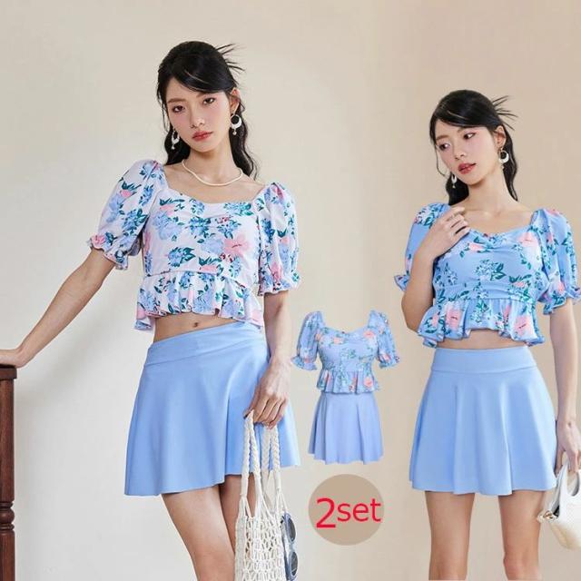 レディース 水着 セパレート ビキニ セットアップ 花柄 フリル リボン おしゃれ みずぎ トップス ノンワイヤー スカート ショーツ付き ブルー 日焼け止め 露出控えめ ビーチ 温泉 水泳 旅行 20代 30代 40代 M L XL 2XL