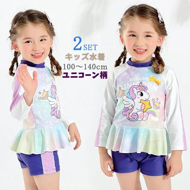 キッズ 水着 女の子 80 子供 水着 セパレート セットアップ 長袖 ラッシュガード ハイネック ショートパンツ ユニコーン カラフル こども 女児 みずぎ 可愛い プール スクール水着 みずぎ 練習 ビーチ 幼稚園 保育園 ホワイト パープル 90 100 110 120 130 140cm