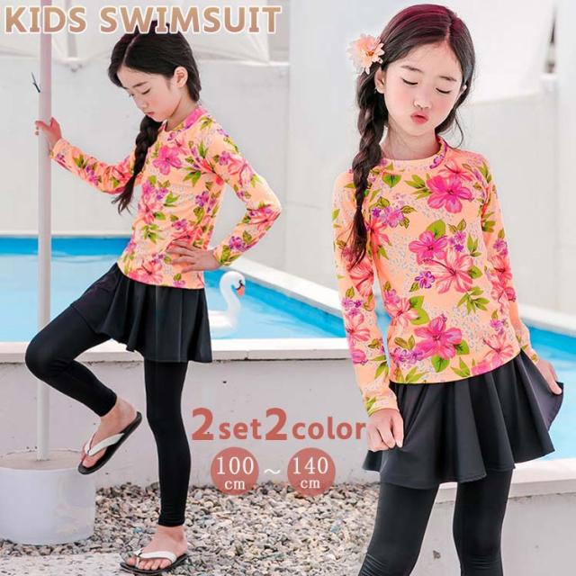 キッズ 水着 女の子 子供 子ども ベビー水着 赤ちゃん 水着 スイムスーツ セパレート ラッシュガード 体型カバー セットアップ 長袖 花柄 スカート レギンス 小学生 お洒落 ピンク 可愛い カラフル ピンク 110 120 130 140cm