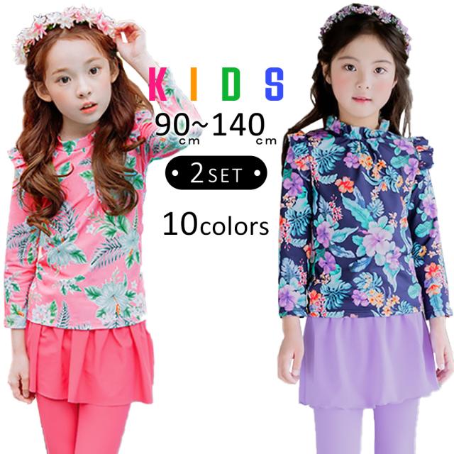 メール便送料無料 水着通販ストア 水着 キッズ 女の子 セパレート 長袖ラッシュガード スカート付き レギンス 2点上下セット フリル ウエストゴム 着やすい 子供 ベビー ジュニア 可愛い お洒落 90cm 100cm 110cm 120cm 130cm 140cm シンプル 総柄 花柄 無地 幼稚園 保育園 小学生 露出控えめ 夏 海