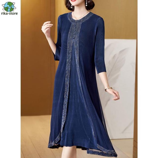 レイヤード風 ワンピース レディース パーティードレス 結婚式 服装 女性 お呼ばれドレス 60代 50代 40代 袖あり 長袖 ミモレワンピース ミモレ丈 膝下 フォーマルワンピース 重ね着風 切り替えワンピース エレガント フォーマル セレモニー きれいめ 上品 ネイビー ブラック パープル