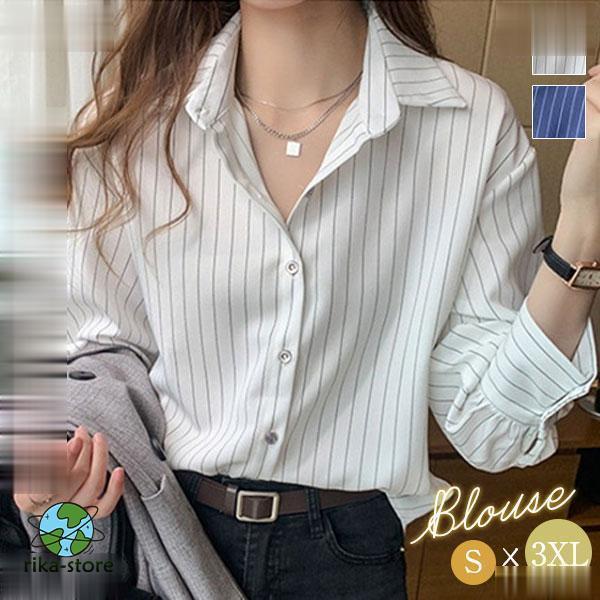 シャツ ブラウス 長袖 レディース ワイシャツ 開襟シャツ 春 秋 ストライプ柄 ビジネス カジュアル オフィス レギュラー 着痩せ 通勤 高級感