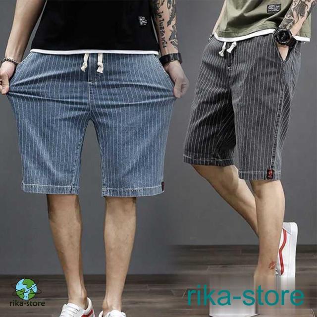 ハーフパンツ メンズ デニムパンツ 五分丈 ジーンズ ショートパンツ ストライプ柄 ストレッチ ボトムス 夏 短パン アメカジ お兄系 無地