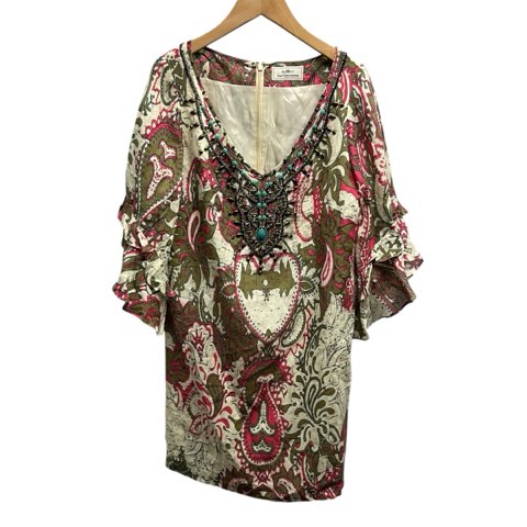 【中古】グレースコンチネンタル ビーズ刺繍 エスニック総柄 チュニックワンピース ドレス 36 Mサイズ相当 ベージュ系
