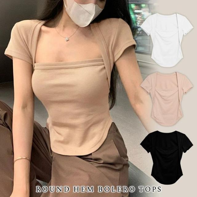 tシャツ レディース 春 夏 春夏 黒 白 半袖 無地 カットソー トップス ラウンドヘム 重ね着風 ボレロ風 半袖トップス 半袖tシャツ チュニック ブラック ホワイト ベージュ 大人 カジュアル 体型カバー