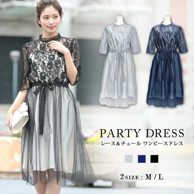 パーティードレス レディース 結婚式 ドレス 紺 黒 ワンピース ミディアム パーティドレス 半袖 Aライン レース ワンピースドレス 大きいサイズ ひざ丈 ブラック グレー ネイビー スーツ フォーマル お呼ばれ