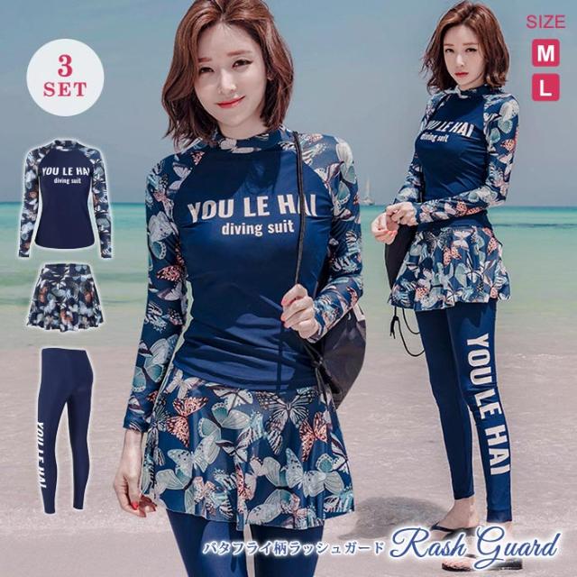 水着 2025 レディース ラッシュガード 冬 3点 セット 水着セット ラッシュガードセット ロゴ バタフライ柄 ロング 長袖 スカート レギンス スイムウエア 大人用 女性 ママ用 海 プール 大人 M L OL