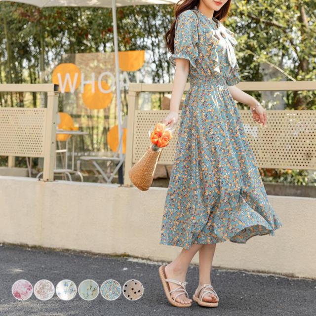 ワンピース 春夏 きれいめ かわいい おしゃれ Aライン Vネック 半袖 5分袖 ロング丈 花柄 ボウタイ ノーカラー シフォン
