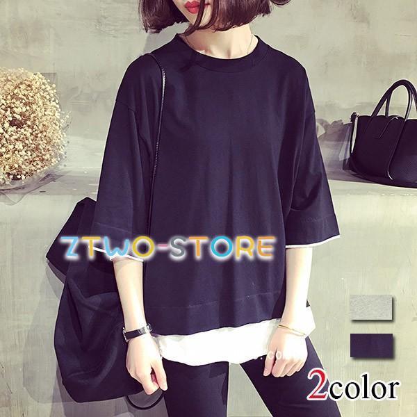 重ね着風無地Tシャツ レイヤード 五分袖 春夏 レディース