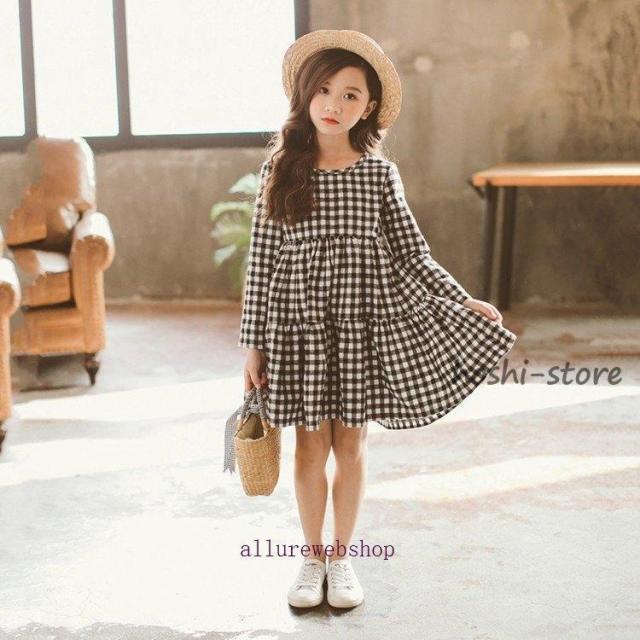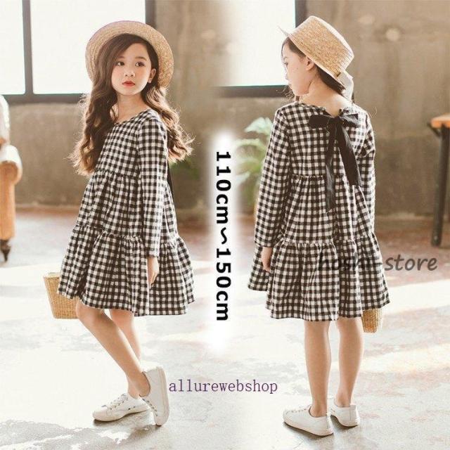 ワンピース キッズワンピース 子供服 キッズ ギンガムチェック 長袖 リボン 女の子 ジュニア カジュアル フレア チェック柄