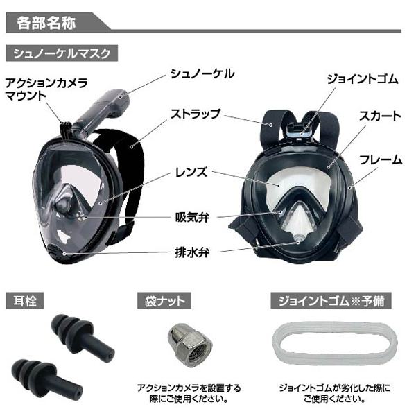 | ※アクションカメラは付属しません。別途ご用意ください。 ※アクションカメラの仕様によっては取り付けられない場合があります。 ※本製品は一般家庭用です。業務用として使用しないでください。 ※ご使用前に安全のためシュノーケルマスクに亀裂や穴など開いていないか、排水弁に異物の挟み込みがないかをご確認ください。異常がある場合は絶対に使用しないでください。 ※顔の形によっては密着できず水が侵入する場合があります。 ※鼻筋上部から下顎までの長さが12cm未満の方、シュノーケルマスクが顔に合わない方は絶対に使用しないでください。 ※シュノーケルとマスクをつけたまま水中に飛び込まないでください。 ※シュノーケルは水面を泳ぐ際に使用するものです。水中ではシュノーケルを使用した呼吸はできません。 |