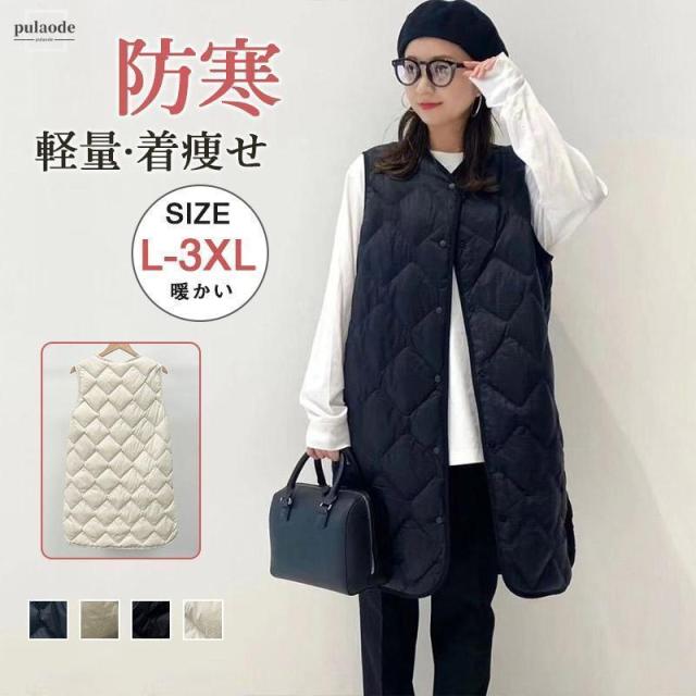 ダウンベスト レディース ロング丈 あったか 細身 軽量 着痩せ 真冬 インナー アウター 薄手 秋冬 暖かい 防寒着 無地 体型カバー 前開き Vネック ノースリーブ