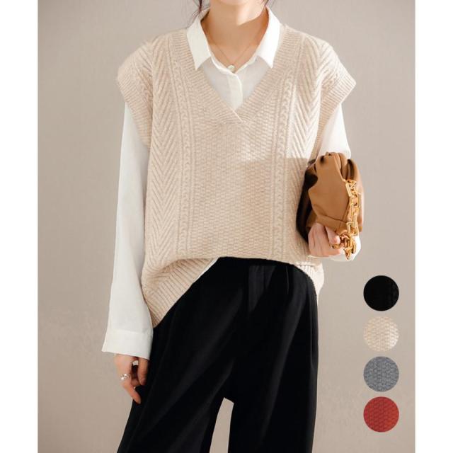 ケーブル編みデザインがアクセントになり、シンプルなコーディネートでも存在感を発揮するニットベスト。