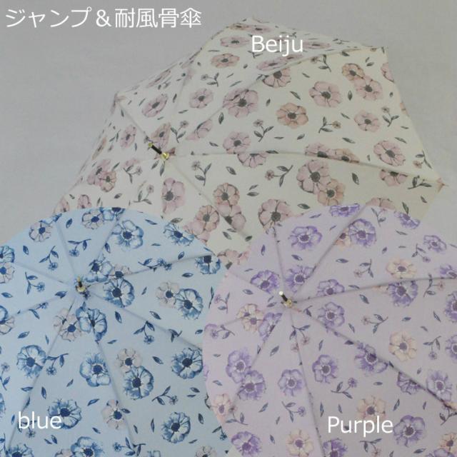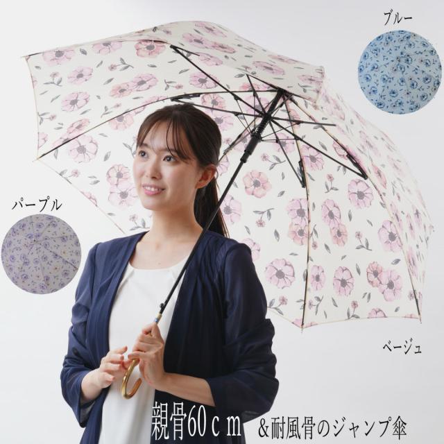 3色から選べる女性用 傘骨8本のジャンプ洋傘 60cm耐風骨フローラル柄 色はベージュ・ブルー・パープルから選択 MJ17780 レディース 雨傘