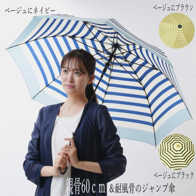 女性用 傘骨8本のジャンプ洋傘 60cmBJ 耐風骨カラーボーダー柄 3色 ブラウン・ネイビー・ブラック MJ17920 レディース 雨傘