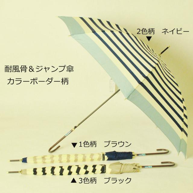 | 傘骨8本の耐風骨【カラーボーダー柄】 ジャンプ洋傘 3色柄 基本色ベージュに 1色柄・ボーダー色ブラウン&ネイビー 2色柄・ボーダー色ネイビー&スカイ、 3色柄・ボーダー色ブラック&ブラウン の3色柄 |