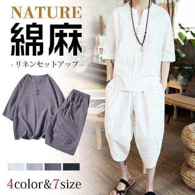 綿麻上下セット セットアップ リネン メンズ ワイドパンツ サルエルパンツ 上下 ルームウェア 半袖 薄手 Tシャツ パンツ 部屋着