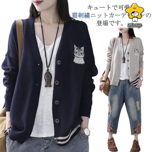 猫柄 刺繍 カーディガン 猫刺繍カーディガン 春 ニットカーディガン レディース 長袖 羽織 ボタン付き ゆったり 森ガール 秋物 春物 セ